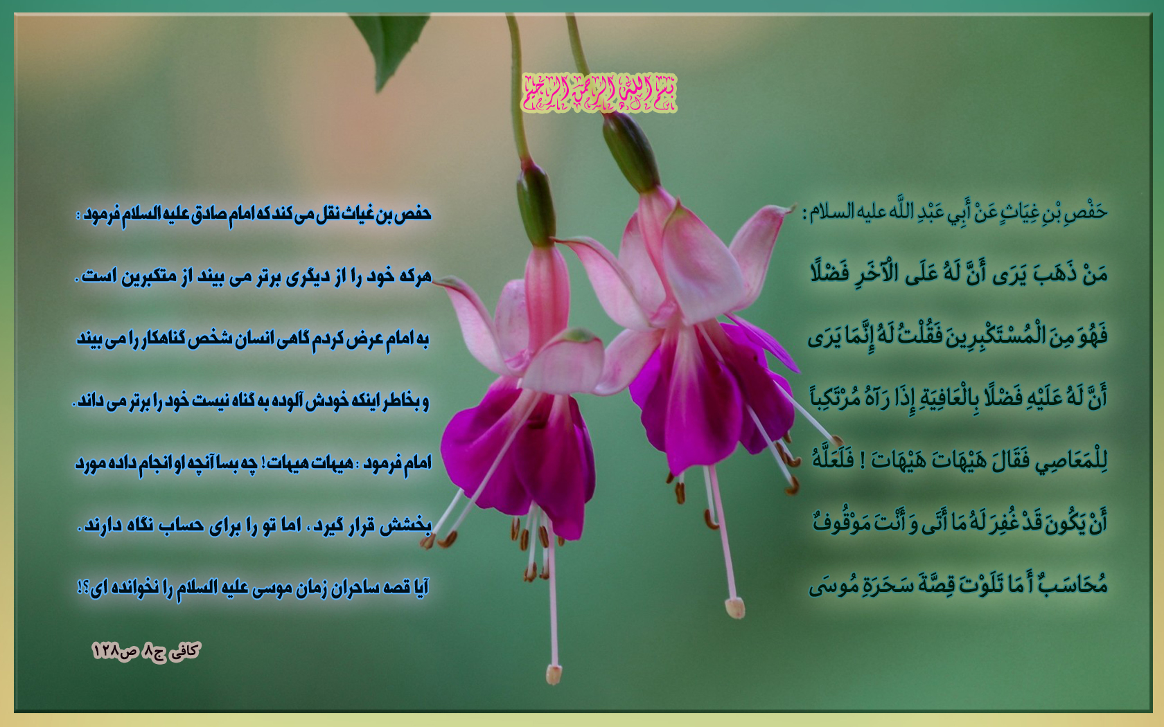 پس هرگاه شخص پایین تر و بدتر را دید بگوید شاید خوبی های این شخص پنهان باشد و این برایش بهتر است و خوبی من ظاهر است و این برایم بد است. وهرگاه کسی را دید که از او بهتر و باتقواتر است برایش تواضع کند تا به او ملحق شود. پس هرگاه چنین کند بزرگی اش بالا گیرد، خوبی هایش پاکیزه شود، از او به خوبی یاد کنند و آقای اهل زمانه اش شود.