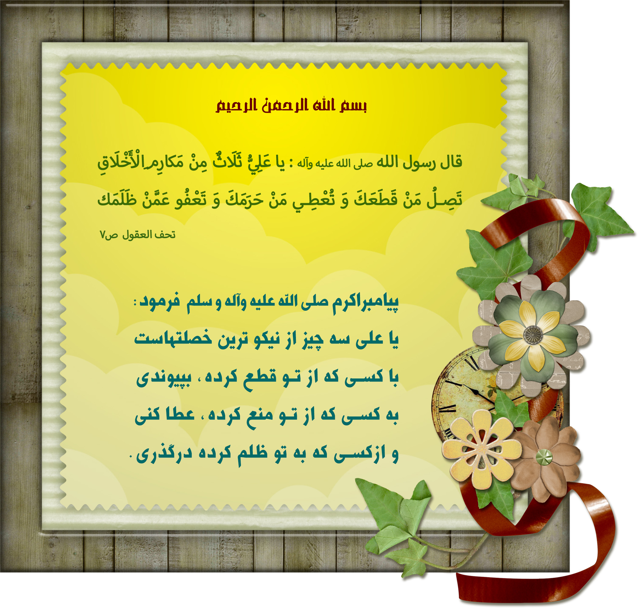 یاعلی اخلاق خود را دربرخورد با خانواده ، همسایگان و آنان که با ایشان رفت و آمد و گفتگو داری نیکو گردان تا نزد خدا به درجات عالی دست یابی.