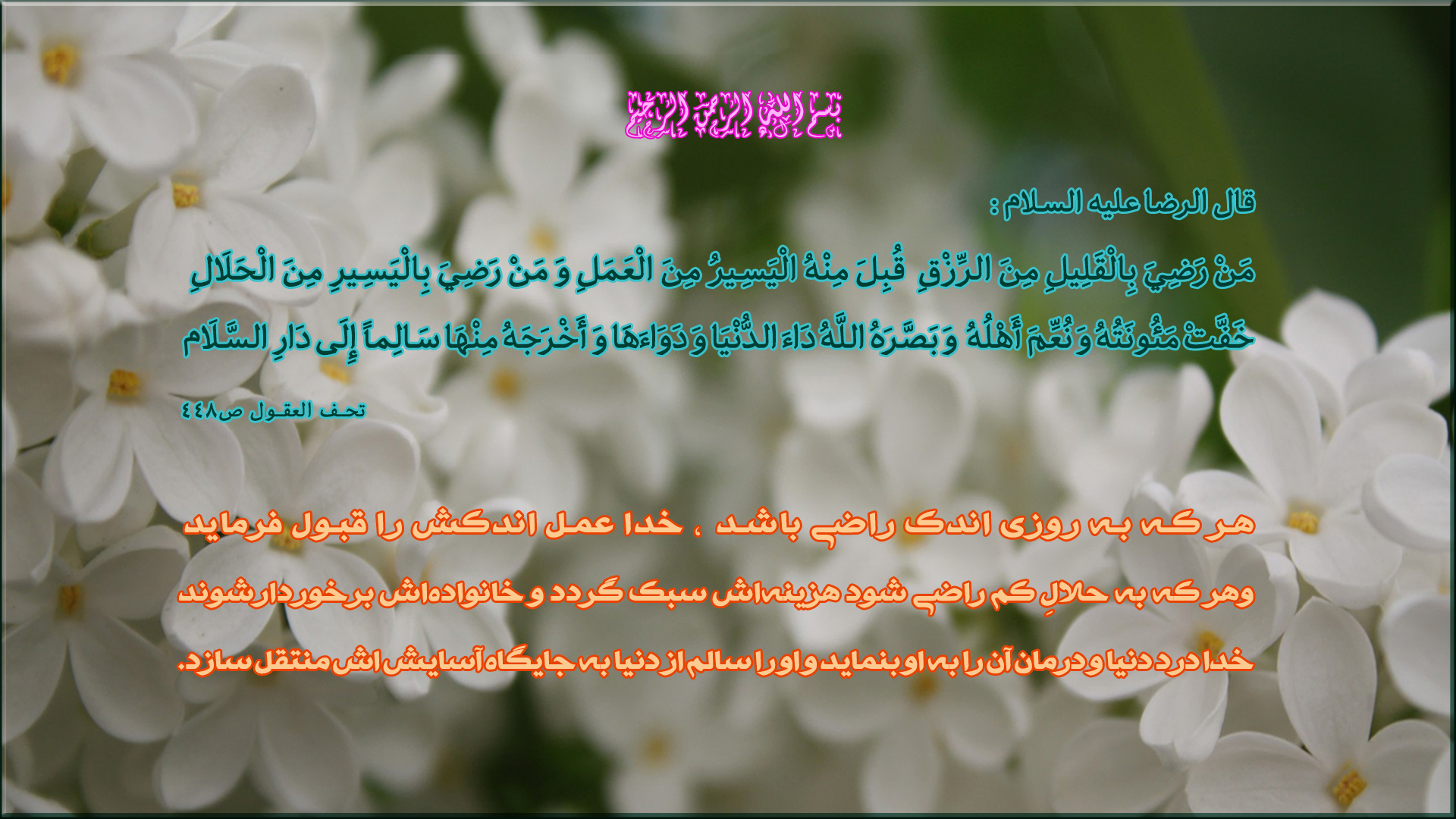 احمد بن عمر و حسین بن یزید می گویند خدمت حضرت رضا علیه السلام رسیده عرض کردیم ما از گشایش روزى و طراوت زندگى برخوردار بودیم، اینک وضعمان اندکى تغییر کرده، دعا کنید خداوند آن نعمت سابق را بازگرداند. فرمود: شما چه مى خواهید؟ مى خواهید پادشاه باشید؟ دوست دارید مثل طاهر (فرمانده لشکر مأمون) و هرثمه (سردار معروف) باشید و بر خلاف مذهبی که دارید (مذهب تشیع) مسلک دیگری داشته باشید؟ گفتم: نه به خدا دوست نداریم دنیا و همه ثروت و زر و سیم آن مال ما باشد و مذهبى غیر از این داشته باشیم. امام فرمود : خداوند می فرماید: اى آل داود سپاس بگزارید و اندکى از بندگان من شاکرند. به خدا خوش گمان باشید، هر که به خدا خوش گمان باشد، خداوند مطابق گمانش با او رفتار مى کند، و هر که به روزى اندک راضی باشد، خدا عمل اندکش را قبول فرماید، و هر که به حلال کم راضى شود هزینه اش سبک گردد، عائله اش برخوردار شوند، خدا درد دنیا و درمان آن را به او بنماید، و او را سالم از دنیا به جایگاه آسایش اش منتقل سازد.