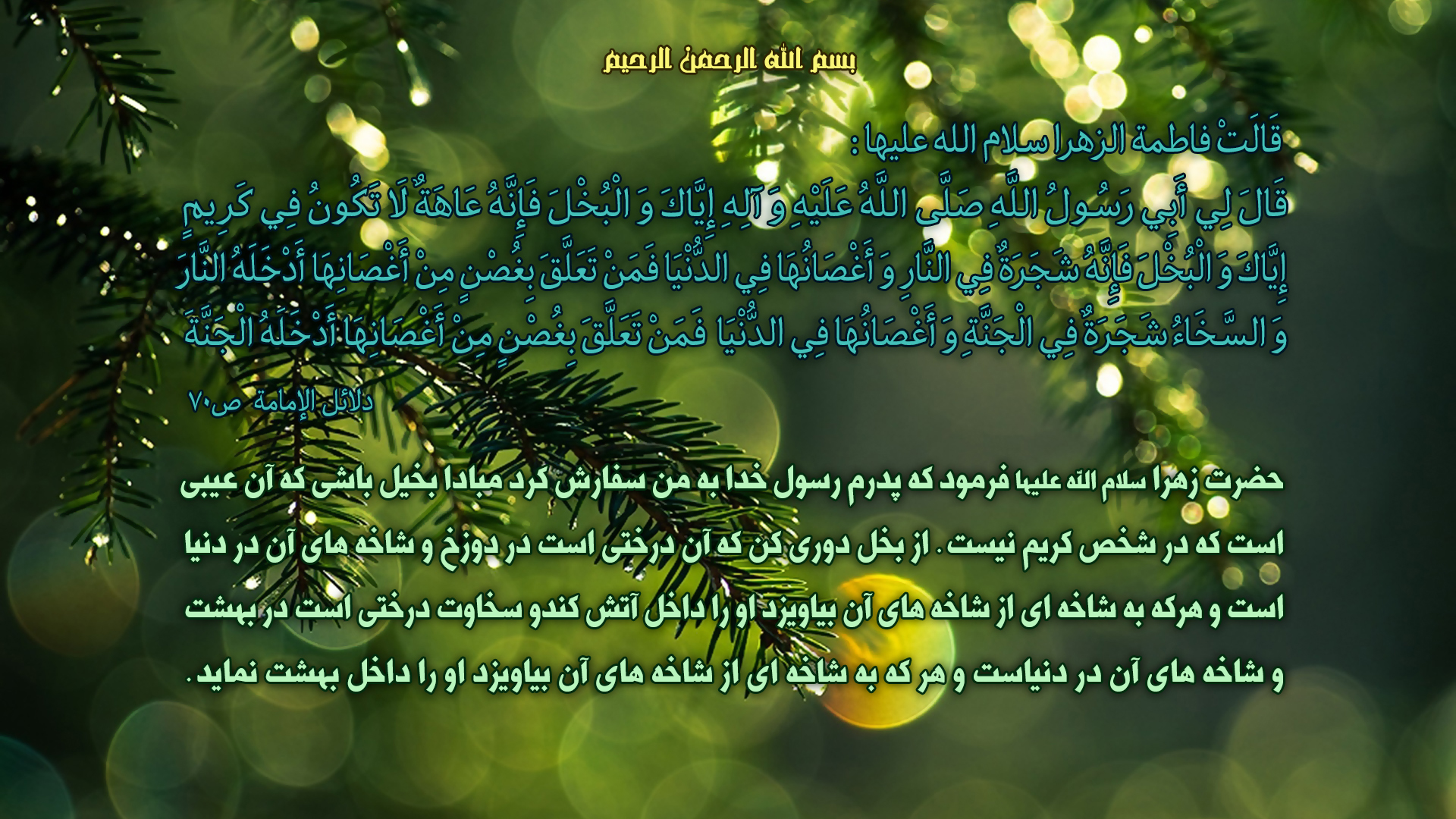 فاطمه بنت الحسین علیهماالسلام از رسول خدا صلی الله علیه وآله نقل می کند که فرمود این سه خصلت در هر که باشد صفات ایمان او کامل است :