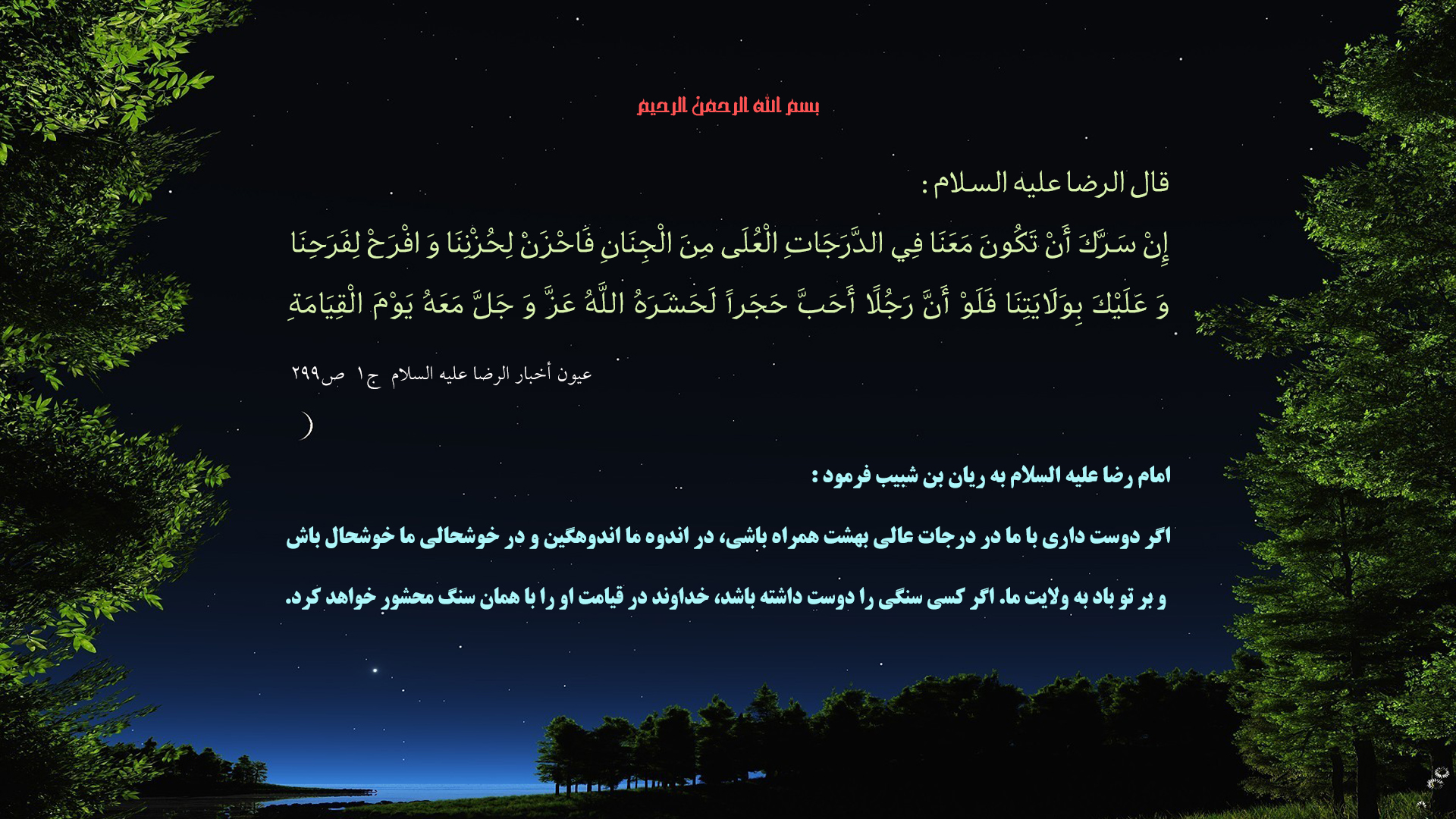 اى ابن شبیب! اگر دوست دارى با ما در درجات عالى بهشت همراه باشى، در اندوه ما اندوهگین و در خوشحالى ما، خوشحال باش، و بر تو باد به ولایت ما، زیرا اگر کسى سنگى را دوست داشته باشد، خداوند در روز قیامت او را با آن سنگ محشور خواهد کرد.
