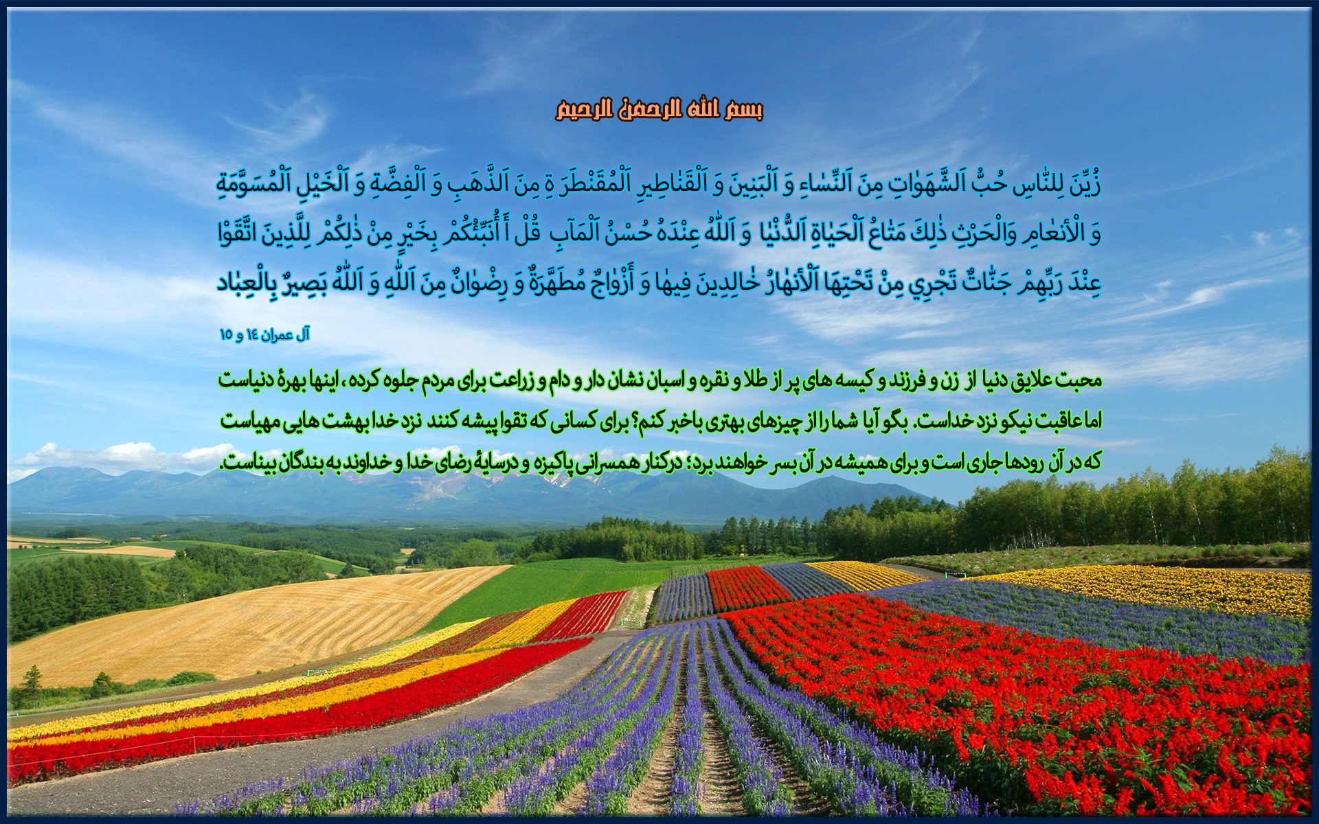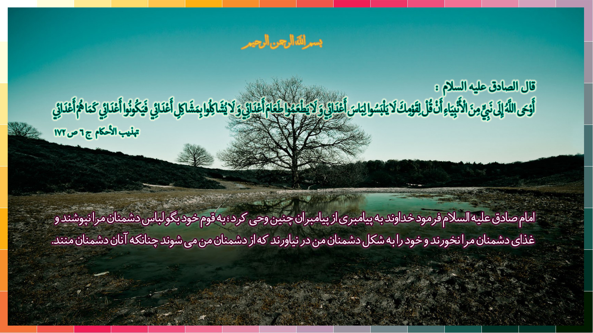 و بدانى آنچه بناست به تو رسد خطا نمی کند و آنچه قرار نیست به تو رسد، سراغ تو نیاید، و این که خدا را به خاطر خشنودى مخلوق به خشم نیاورى، و دنیا را بر آخرت ترجیح ندهى زیرا که دنیا فانى و آخرت پایدار است و از آنچه توانایى دارى بر برادرانت بخل نورزى و درونت همانند بیرونت باشد، بیرونت نیک و درونت زشت نباشد که در این صورت از منافقان خواهى بود، دروغ مگویى، با دروغگویان میامیزی، و آنگاه که سخن حق شنیدى خشمگین مباشی و تا مى توانى خود، خانواده، فرزندان و همسایگانت را ادب کنی و به آنچه مى دانى عمل کنی و با هیچ یک از آفریدگان خداى متعال جز به حق رفتار نکنی، و نسبت به خویشاوند و بیگانه خوش رفتار باشى، و ستمگر و کینه توز نباشی و بسیار سبحان اللَّه و لا اله الا اللَّه بگویی و فراوان دعا کنی و زیاد به یاد مرگ و قیامت و بهشت و دوزخ باشی.