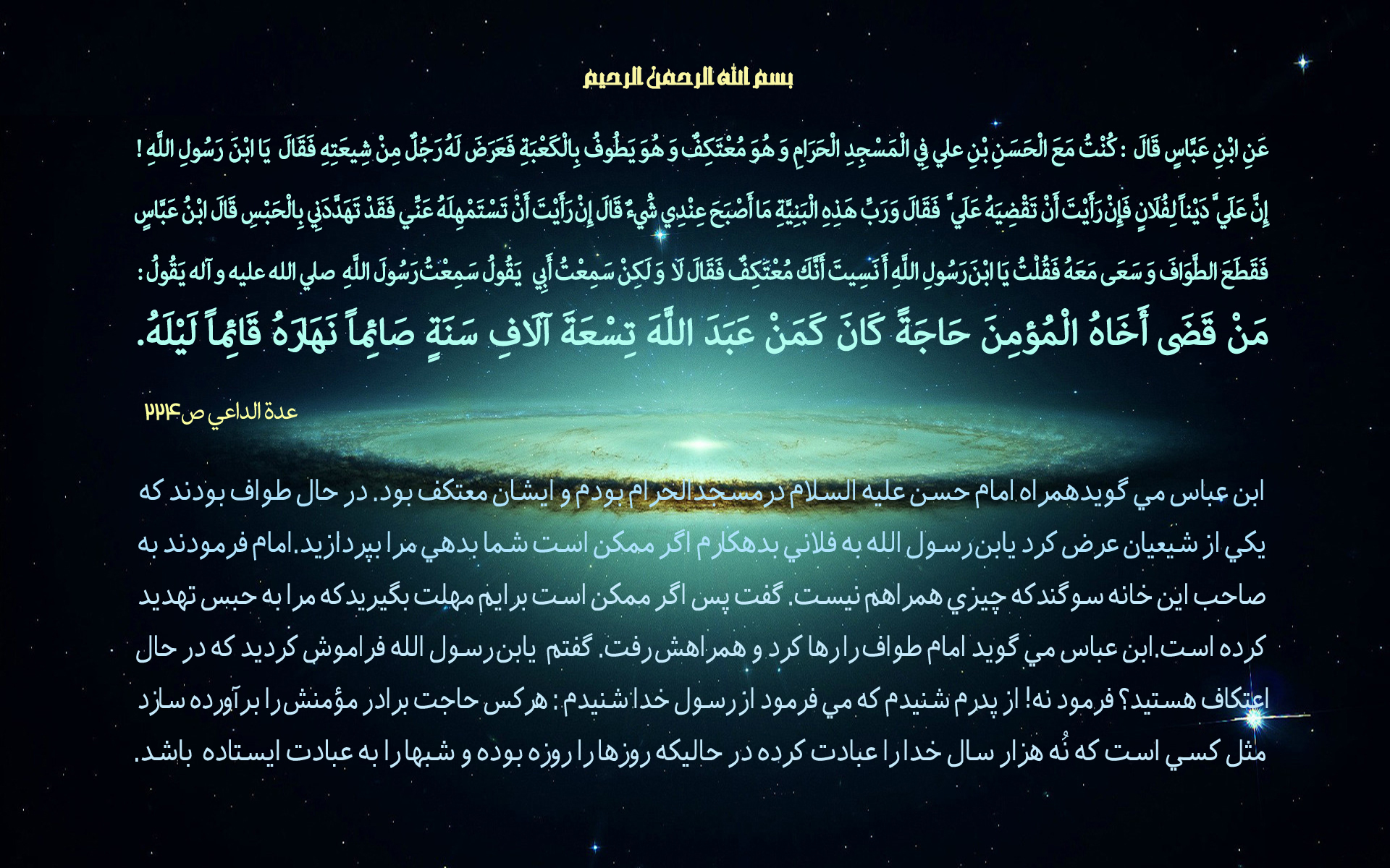 مَنْ سَعَى فِی حَاجَةِ أَخِیهِ الْمُسْلِمِ فَاجْتَهَدَ فِیهَا فَأَجْرَى اللَّهُ عَلَى یَدَیْهِ قَضَاءَهَا کَتَبَ اللَّهُ عَزَّ وَ جَلَّ لَهُ حَجَّةً وَ عُمْرَةً وَ اعْتِکَافَ شَهْرَیْنِ فِی الْمَسْجِدِ الْحَرَامِ وَ صِیَامَهُمَا وَ إِنِ اجْتَهَدَ فِیهَا وَ لَمْ یُجْرِ اللَّهُ قَضَاءَهَا عَلَى یَدَیْهِ کَتَبَ اللَّهُ عَزَّ وَ جَلَّ لَهُ حَجَّةً وَ عُمْرَةً.